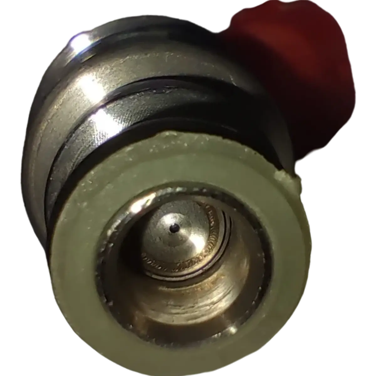 Por el extremo externo se acopla el conducto de alta presión procedente de la bomba de inyección. El cuerpo del inyector aparece seccionado, una pieza en forma de cilindro terminado en punta entra a la cámara de combustión. Esta pieza se conoce como tobera y es la encargada de pulverizar el combustible para formar el aerosol